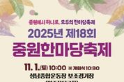 K-Classic News 기자 | ‘제18회 중원한마당축제’가 오는 11월 1일 오전 10시부터 오후 2시 30분까지 2000여 명이 참석한 가운데 성남종합운동장 보조경기장에서 열린다. 성남시 중원구가 후원하고, 중원한마당축제 추진위원회가 주최·주관해 열리는 이번 행사는 ‘중원에서 하나로, 모두의 한마당 축제’를 주제로 진행된다. 이날 특설무대에선 11개 동 주민 대표가 출연해 넘치는 끼와 노래 실력을 선보이는 ‘우리 동네 인기스타’ 공연이 펼쳐진다. 초청 가수 윤수현의 ‘천태만상’ 등 트로트 공연, 신인 아이돌 걸그룹 아스텔의 ‘슈퍼노바’, ‘아일랜드’ 등의 공연, 중원유스센터 청소년 보컬 동아리와 댄스 동아리 공연도 열려 축제 분위기를 달군다. 시민 체험 행사도 다양하다. 행사장 곳곳에 총 11개 체험 부스를 설치해 4차산업과 관련한 드론 축구, 가상현실(VR) 트럭 체험, 배틀 로봇 등과 페이스페인팅, 목공 체험 등을 해볼 수 있다. 중원구 관계자는 “주민 간 화합을 도모하고, 신나고 활기찬 지역 분위기를 조성하는 장이 될 것”이라고 말했다.