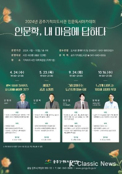 K-Classic News 기자 | 공주시는 공주기적의도서관에서 ‘인문학, 내 마음에 답하다’를 주제로 2024년 인문독서아카데미를 운영한다고 26일 밝혔다.