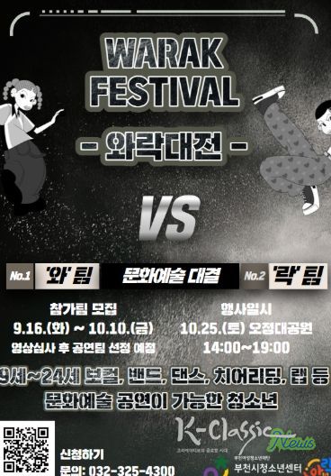 K-Classic News 기자 | 부천여성청소년재단이 운영하는 부천시청소년센터는 오는 10월 25일 오후 2시, 오정대공원에서‘와!락(樂) 페스티벌’을 개최한다고 밝혔다.