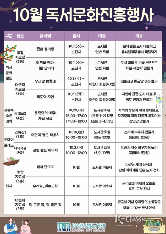 K-Classic News 기자 | 책 읽기 좋은 계절인 10월, 사천시립도서관에서는 책과 함께 깊어지는 가을을 느낄 수 있도록 다양한 독서문화진흥행사를 마련했다.