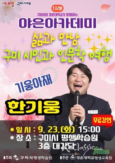 K-Classic News 기자 | 구미시는 9월 23일 오후 3시 구미시평생학습원 대강당에서 방송인 한기웅을 초청해 ‘삶과 만남, 구미시민과 인문학 여행’이라는 주제로 제132회 야은아카데미 특별 강연을 연다.