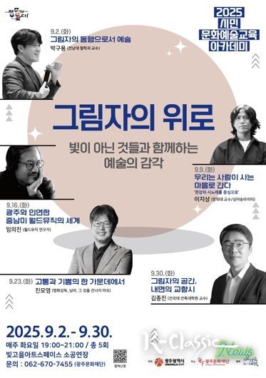 올해 아카데미는 ‘그림자의 위로–빛이 아닌 것들과 함께하는 예술의 감각’을 주제로, 매주 화요일 총 5회에 걸쳐 진행된다. 광주문화재단과 (사)인문도시연구원 시민자유대학이 협력해 추진하며, 강연과 공연이 결합된 강연형 콘서트로 시민들의 큰 관심을 모으고 있다.