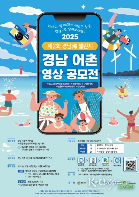 K-Classic News 기자 | 경상남도는 경남 바다와 어촌의 매력을 국민의 눈으로 담아내고, 어촌에 대한 관심을 높이기 위해 2025년 경상남도 어촌영상공모전 ‘경남海 챌린지’를 개최한다.