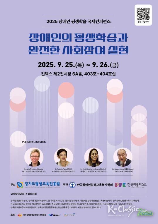 K-Classic News 기자 | 경기도와 경기도평생교육진흥원이 26일 고양 킨텍스 제2전시장 6A홀에서 ‘2025 장애인 평생교육 국제 학술대회’를 개최한다. 장애인 평생학습권 보장을 위해 국내를 넘어 국제적 차원의 논의장을 마련한 것은 이번이 전국 최초이다.