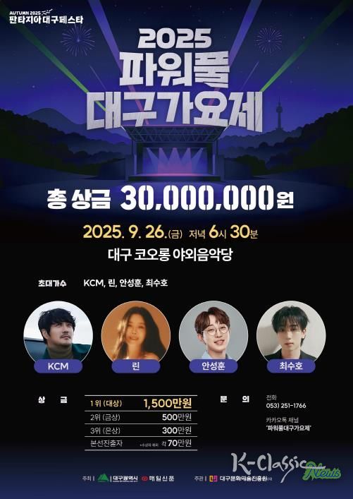 K-Classic News 기자 | 대구광역시는 오는 9월 26일 오후 6시 30분, 코오롱 야외음악당에서 전국의 재능 있는 음악인들에게 무대의 기회를 제공하고, 시민과 함께하는 가요경연 축제인 ‘2025 파워풀 대구가요제’를 개최한다.