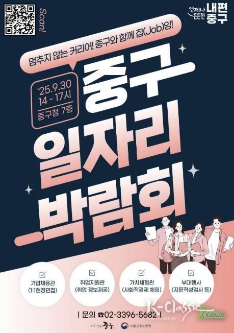 K-Classic News 기자 | 서울 중구가 오는 30일 오후 2시부터 5시까지 중구청 7층 대강당에서 '2025 중구 일자리박람회'를 개최한다.