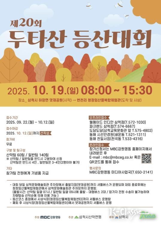 K-Classic News 기자 | 삼척시는 오는 10월 19일 하장면 댓재공원에서 『제20회 두타산 등산대회』를 개최한다. 올해로 20회를 맞이하는 이번 대회는 청정한 자연환경을 자랑하는 두타산에서 가을 정취를 만끽하며 건강과 화합을 도모하기 위해 마련됐다.