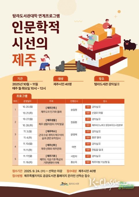 K-Classic News 기자 | 제주시 탐라도서관은 제주시민을 대상으로 제주만의 건축, 생물, 역사, 신화, 기후를 깊이 있게 탐구하는 ‘인문학적 시선의 제주’ 참여자를 모집한다.