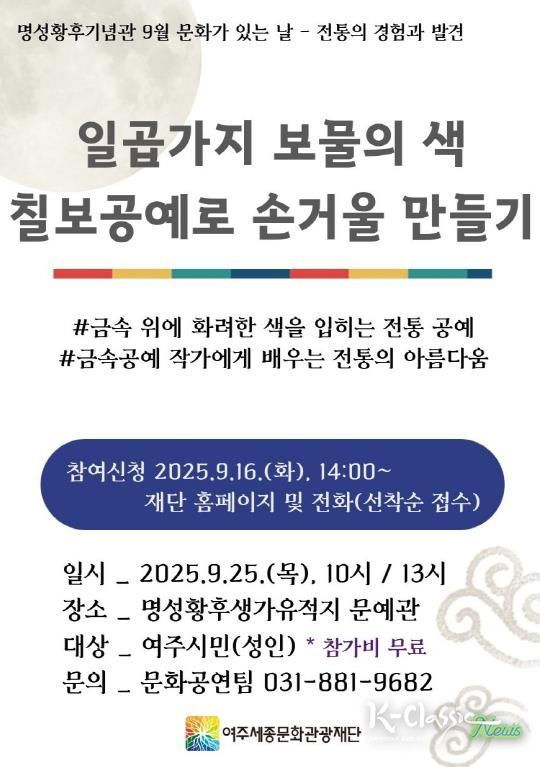 K-Classic News 기자 | 여주세종문화관광재단은 오는 9월 25일, 명성황후기념관 9월 문화가 있는 날 프로그램으로‘일곱가지 보물의 색, 칠보공예로 손거울 만들기’를 진행한다.