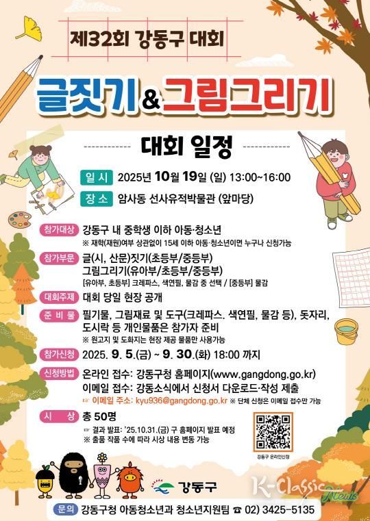K-Classic News 기자 | 강동구는 오는 10월 19일 암사동 선사유적박물관에서 '제32회 강동구 아동·청소년 글짓기 및 그림그리기 대회'를 개최한다고 밝혔다.