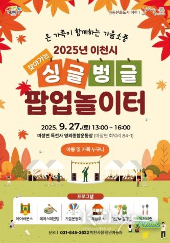 K-Classic News 기자 | 이천시는 아동친화도시 놀이문화 확산과 아동의 놀 권리 보장을 위해 '찾아가는 싱글벙글 팝업 놀이터 ‘가을소풍’' 행사를 오는 9월 27일 마장면 특전사 영외종합운동장에서 개최한다고 밝혔다.