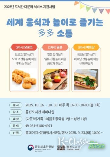 K-Classic News 기자 | 김포시 통진도서관은 다문화 프로그램 ‘세계 음식과 놀이로 즐기는 다다(多多) 소통’을 오는 10월 16일부터 10월 30일까지 매주 목요일 오후 4시마다 세미나실에서 운영한다고 밝혔다.