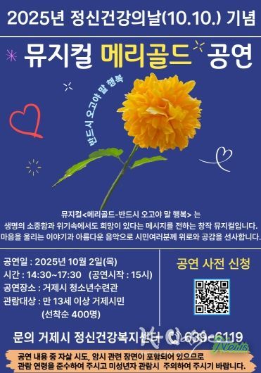 K-Classic News 기자 | 거제시는 10월 2일 오후 3시부터 5시 30분까지 거제시 청소년수련관 대강당에서 ‘2025년 정신건강의 날’을 기념하여 뮤지컬 메리골드를 공연한다.