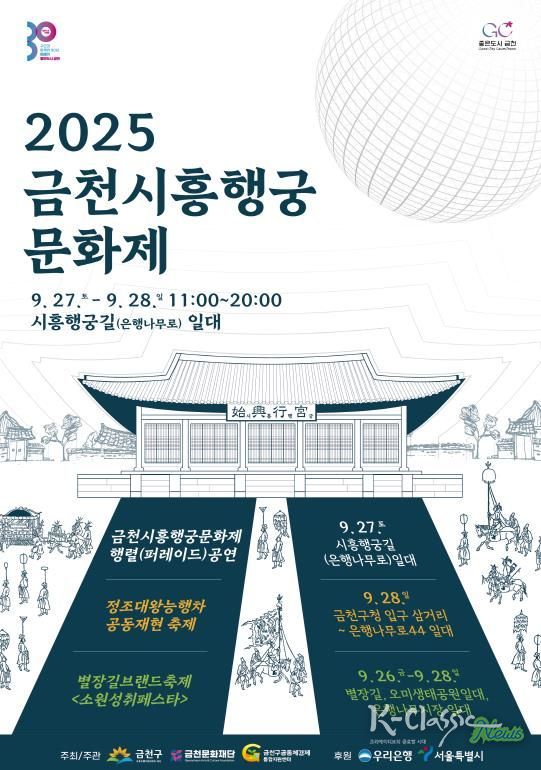 K-Classic News 기자 | 금천구와 금천문화재단은 27일과 28일 양일간 금천구 은행나무로 일대에서 ‘2025 금천시흥행궁문화제’를 개최한다고 밝혔다. 인근에서 하루 전날인 26일부터 지역 대표 축제인 ‘2025 별장길 브랜드 축제(부제: 소원성취페스타 소·성·페)‘도 열려 축제의 한마당이 펼쳐질 것이라고 구는 설명했다.