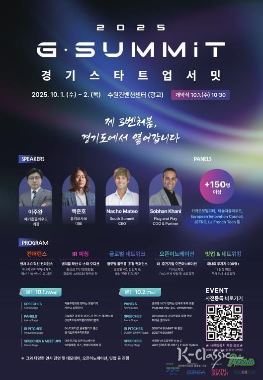 K-Classic News 기자 | 국내 최고 수준의 글로벌 스타트업 투자 박람회인 ‘경기 스타트업 서밋(G-SUMMIT)’이 오는 10월 1일부터 2일까지 수원컨벤션센터에서 열린다.