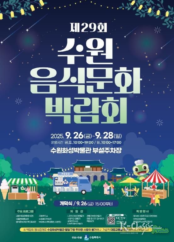 K-Classic News 기자 | 제29회 수원음식문화박람회가 9월 26~28일 수원화성박물관 부설주차장에서 열린다.