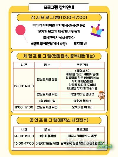 축제 주요 프로그램으로는 아이들의 상상력을 자극하는 ‘마법의 도서관’ 매직쇼와 꿈과 희망을 담은 버블&벌룬쇼가 펼쳐지며, 도서관 주변에는 ▲책 속 주인공 ‘무지개 물고기’ 바람개비 만들기 ▲풍선키다리아저씨와의 만남 ▲스탬프 투어 ▲각인각色 인생네컷 촬영 등 다채로운 체험을 할 수 있는 부스도 마련될 예정이다.