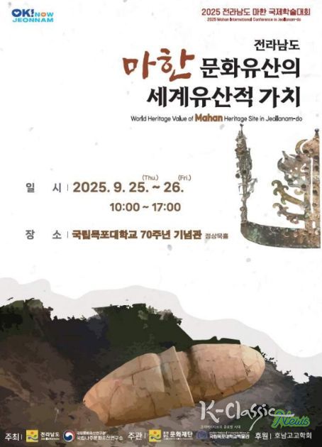 K-Classic News 기자 | 국가유산청 국립문화유산연구원 국립나주문화유산연구소는 전라남도와 함께 9월 25일부터 26일까지 국립목포대학교 70주년 기념관(전남 무안군)에서 '전라남도 마한 문화유산의 세계유산적 가치'를 주제로 국제학술대회를 개최한다.