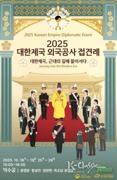 K-Classic News 기자 | 국가유산청 궁능유적본부는 국가유산진흥원과 함께 10월 18일~19일, 25일~26일 오후 3시 덕수궁(서울 중구)에서 고종 황제가 외국공사를 접견하는 의례와 연회를 재현한 공연 '2025년 대한제국 외국공사 접견례'를 개최한다.
