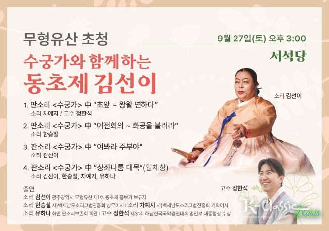 K-Classic News 기자 | 광주문화재단 전통문화관은 오는 9월 27일 오후 3시, 토요상설공연 20회차 무대에서 광주광역시 무형유산 제1호 동초제 흥보가 보유자 김선이 명창과 차세대 소리꾼들이 함께하는 특별한 판소리 무대를 선보인다.