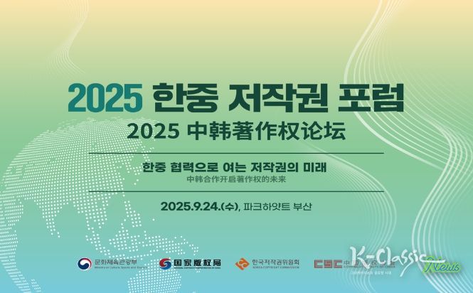 K-Classic News 기자 | 문화체육관광부는 한국저작권위원회, 중국 국가판권국과 함께 9월 24일, 파크하얏트 부산에서 ‘2025 한중 저작권 정부간회의(오전)’와 ‘2025 한중 저작권 포럼(오후)’을 열어 저작권 보호를 위한 양국 협력 방안과 인공지능(AI), 블록체인 등 기술 발전에 따른 저작권 정책 변화 및 대응을 논의한다.