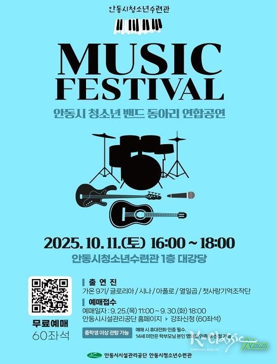 K-Classic News 기자 | 안동시시설관리공단에서 운영하는 안동시청소년수련관이 '2025 안동시 청소년 밴드 동아리 연합공연 ‘뮤직 페스티벌’'을 오는 10월 11일 청소년수련관 대강당에서 개최한다고 밝혔다.