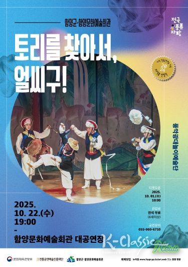 K-Classic News 기자 | 함양군문화예술회관은 풍악광대놀이“토리를 찾아서, 얼씨구!”공연이 10월 22일 오후 7시 함양문화예술회관 대공연장에서 개최한다고 밝혔다.