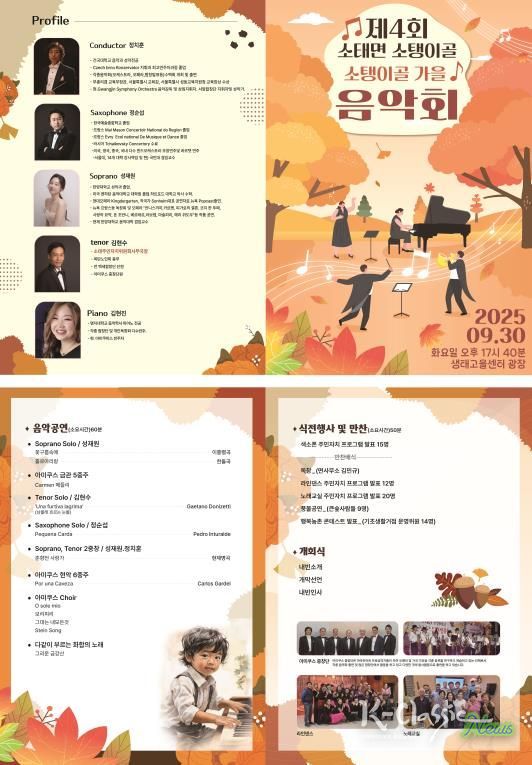 K-Classic News 기자 | 충주시 소태면 주민자치위원회은 오는 9월 30일 오후 5시 40분, ‘2025년 제4회 소탱이골 작은 음악회’를 개최한다고 밝혔다.