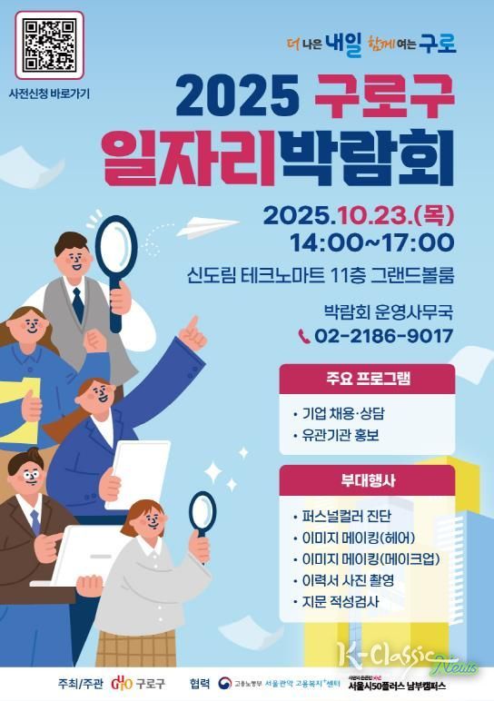 아울러 구는 9월 16일부터 10월 23일까지 행사 당일 혼잡을 줄이기 위해 참여를 원하는 구직자 대상으로 사전등록을 운영하며, 포스터의 큐알(QR)코드를 통해 신청하면 된다.