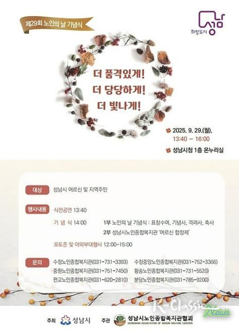 K-Classic News 기자 | 성남시는 ‘제29회 노인의 날(10.2)’을 맞아 오는 9월 29일 오후 1시 40분 시청 1층 온누리에서 “더 품격있게! 더 당당하게! 더 빛나게!”를 주제로 기념행사를 연다.