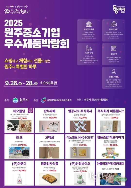 K-Classic News 기자 | 원주시가 주최하고 강원특별자치도경제진흥원이 주관하는 ‘2025 원주 중소기업 우수제품 박람회’가 오는 26일 오전 10시 30분, 치악체육관 무대에서 개막식을 열고 28일까지 3일간 이어지는 행사의 막을 올린다.