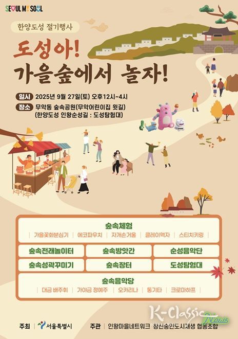 K-Classic News 기자 | 서울시는 9월 27일 오후 12시부터 4시까지, 한양도성 인왕구간과 무악동 숲속 공원 일대에서 한양도성 절기행사인 ‘도성아! 가을 숲에서 놀자!’를 개최한다. 코스모스가 만개한 도성을 걸으며 역사와 자연, 전통 문화를 함께 즐길 수 있는 자리로, 인왕산 아래 마을 공동체와 서울시가 함께 준비했다.