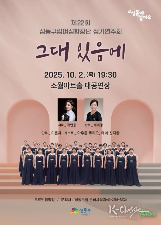K-Classic News 기자 | 서울 성동구는 오는 10월 2일 저녁 7시 30분 소월아트홀에서 성동구립 여성합창단 '제22회 정기 공연'을 개최한다고 밝혔다. 공연 부제는 '그대 있음에'로 가을밤, 구민들에게 사랑과 위로의 하모니를 선사할 예정이다.