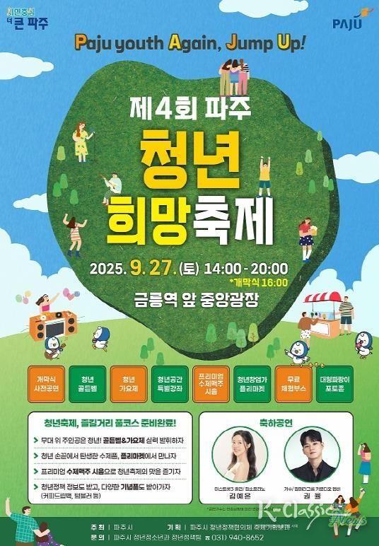K-Classic News 기자 | 파주시는 청년의 날을 맞아 청년들이 함께 소통하고 공감하며 즐길 수 있는 교류의 장인 ‘제4회 파주 청년희망축제’를 오는 27일 14시부터 20시까지 금릉역 앞 중앙광장에서 개최한다.