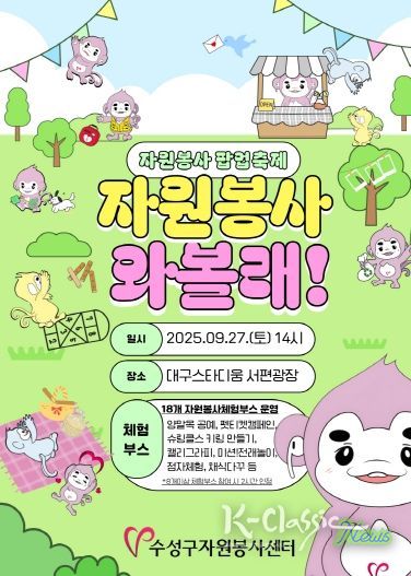 K-Classic News 기자 | 대구 수성구자원봉사센터(센터장 이기덕)는 오는 27일 대구스타디움 서편광장에서 '자원봉사 팝업축제, 자원봉사 와볼래'를 개최한다. 이번 축제는 지역 주민들이 일상 속에서 자원봉사를 쉽게 체험하고, 자연스러운 참여 문화를 확산하기 위해 마련됐다.