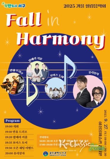 K-Classic News 기자 | 광주광역시 서구는 오는 27일 오후 7시 농성동 하정웅미술관 앞 잔디광장에서 ‘2025 가을 힐링음악회 – 폴 인 하모니(Fall in Harmony)’를 개최한다.