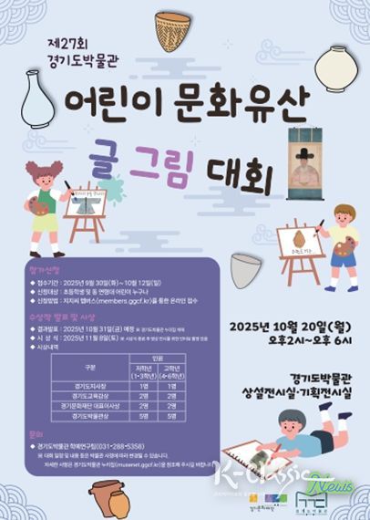 K-Classic News 기자 | 경기문화재단 경기도박물관은 오는 10월 20일, 〈제27회 경기도박물관 어린이 문화유산 글그림 대회〉를 개최한다. 올해로 스물일곱 번째를 맞이하는 이번 대회는 어린이들이 경기도박물관 전시실에 모여 전시 중인 문화유산을 직접 살펴보고, 이를 바탕으로 그림과 글로 창의력을 발휘하는 자리이다.