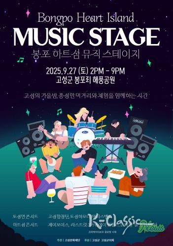 K-Classic News 기자 | 고성군과 고성문화재단은 오는 9월 27일 토요일 오후 2시부터 밤 9시까지 토성면 봉포리 해풍공원에서 ‘제3회 봉포하트섬 뮤직 스테이지’를 개최한다.