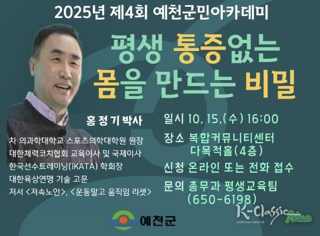 K-Classic News 기자 | 예천군은 10월 15일 오후 4시, 복합커뮤니티센터 다목적홀에서 ‘2025년 제4회 예천군민 아카데미’를 개최한다.