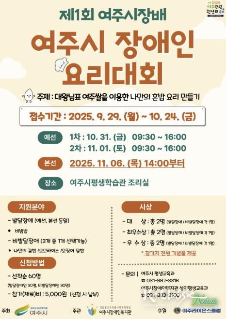 K-Classic News 기자 | 여주시는 장애인의 자립역량을 강화하고 평생학습 실천 기회를 확대하기 위해 오는 11월 6일 오후 1시부터 5시까지 여주시평생학습관 요리실에서 '제1회 여주시장배 장애인요리대회'를 개최한다. 이번 대회는 여주시가 주최하고 여주시장애인복지관이 주관하여 진행된다.
