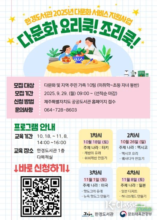K-Classic News 기자 | 제주시 한경도서관은 오는 10월 18일부터 11월 8일까지 매주 토요일 도서관 1층 다목적실에서 다문화 요리 체험 프로그램 ‘다문화 요리쿡! 조리쿡!’을 운영한다.