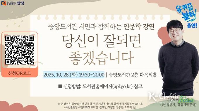 K-Classic News 기자 | 안성시는 오는 10월 28일 저녁 7시 30분, 중앙도서관 다목적홀에서 정미소출판사 대표이자 『당신이 잘되면 좋겠습니다』의 저자 김민섭 작가를 초청해 시민 강연회를 개최한다.