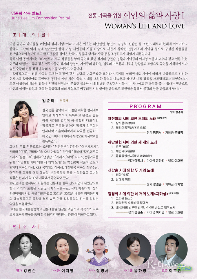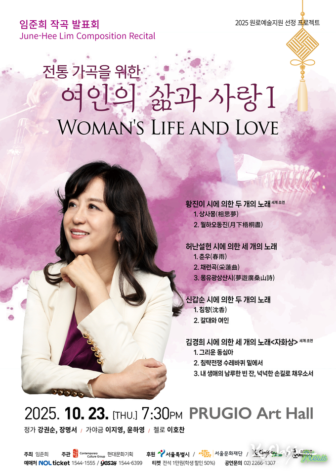 이 음악회는 서울문화재단의 2025 원로예술지원 사업에 선정된 프로젝트로 허난설헌, 황진이, 김경희, 신갑순등 조선 시대부터 현대에 이르기까지 한국의 고난의 역사 속에 살아왔던 한국 여성 시인들의 시를 바탕으로 작곡가 임준희에 의해 새롭게 창작된 전통 가곡과 가야금, 첼로등으로 구성된 작품들을 선보임을 통하여 험난하고도 굴곡진 삶을 살아온 한국 여성들의 생애와 사랑등을 조명하고자 기획되었다.