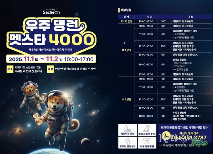 K-Classic News 기자 | 사천시가 제17회 사천시농업한마당축제장 내 반려견과 함께하는 ‘우주 댕런 펫스타 4000’를 오는 11월 1일부터 2일까지 2일간 사천시청 노을광장 일원에서 개최한다고 24일 밝혔다.