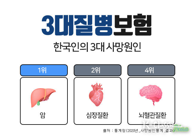K-Classic News 기자 | 흔히 3대질병이라 일컫는 암, 심혈관질환, 뇌혈관질환은 통계청 발표자료에 따르면 한국인의 주요 사망원인 중에서 3위 폐렴을 제외하고 1~4위를 차지하고 있으며, 이전부터 지금까지도 살면서 가장 먼저 대비해야 하는 치명적인 질병으로 강조되고 있다. 이러한 중대질병에 대비하기 위하여 상기 세가지 치명적인 질병을 집중보장하는 3대질병진단비보험을 많이 가입하고 있다. 3대진단비보험은 각각의 질병을 중점적으로 보장하면서도 가입자 특성에 맞는 특약을 추가함으로써 종합건강보험으로도 활용할 수가 있다.