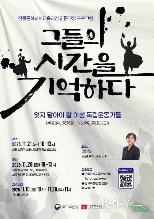 K-Classic News 기자 | 국가유산청 한국전통문화대학교 전통문화교육원은 11월 21일과 28일, 2회에 걸쳐 2025년도 인문교양프로그램 '그들의 시간을 기억하다 - 잊지 말아야 할 여성 독립운동가들'을 운영한다.