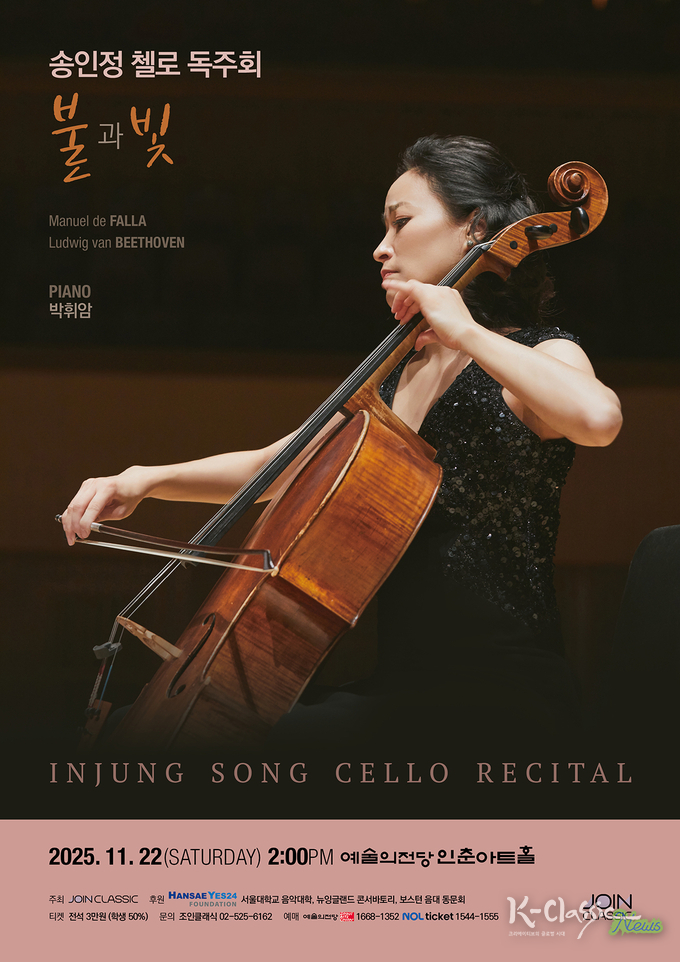 첼리스트 송인정은 12세에 데뷔했다. 국내외 다수 콩쿠르에서 수상했고, 뉴잉글랜드 콘서바토리와 보스턴대학교에서 석박사 학위를 받았다. 카네기홀 뉴욕데뷔 독주회를 비롯 세계 유수 무대에서 호평받았다. KBS교향악단, 서울시향 등 국내 정상급 오케스트라와 협연했다. 음악을 통한 사회공헌에도 적극적이며, 명동대성당 무반주 첼로 모음곡 전곡 연주회를 통해 수익을 소아환아 후원에 기부했다.