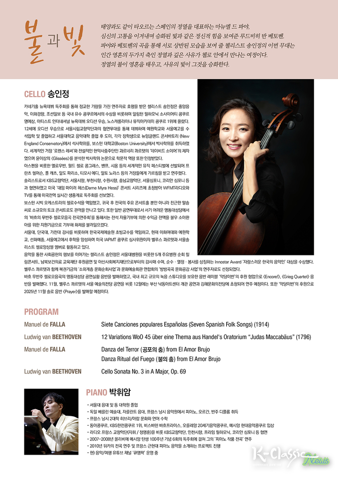 태양과도 같이 타오르는 스페인의 정열을 대표하는 마뉴엘 드 파야(Manuel de Falla y Matheu, 1876-1946), 심신의 고통을 이겨내며 승화된 빛과 같은 정신적 힘을 보여준 루드비히 반 베토벤(Ludwig van Beethoven, 1770-1827). 위대한 두 작곡가의 작품을 통해 서로 상반된 모습을 보여 줄 이번 무대는 인간 영혼의 두 가지 축인 '불의 정열'과 '빛의 사유'가 첼로 안에서 만나는 여정이다.