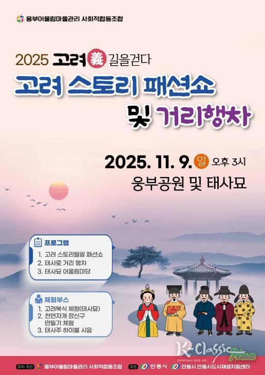 K-Classic News 기자 | 안동시 중구동 일대를 중심으로 지역 활력 증진과 주민 역량 강화를 위해 활동 중인 웅부어울림마을관리 사회적협동조합이 오는 11월 9일 오후 3시, 안동 웅부공원 일원에서 ‘태사길 마을축제 〈고려義 길을 걷다〉’를 개최한다.
