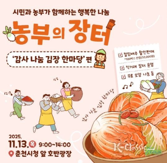 ‘춘천시 농부의 장터- 감사 나눔 김장 한마당편’이 13일 오전 9시부터 오후 2시까지 시청광장에서 열린다. 이 행사는 한 해 동안 직거래 장터를 통해 시민의 사랑을 받아온 지역 농가들이 감사의 뜻을 전하기 위해 자발적으로 마련한 자리다.